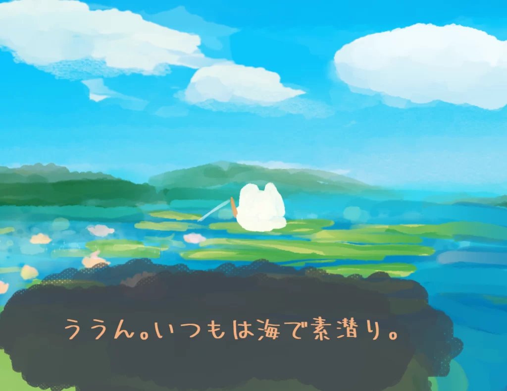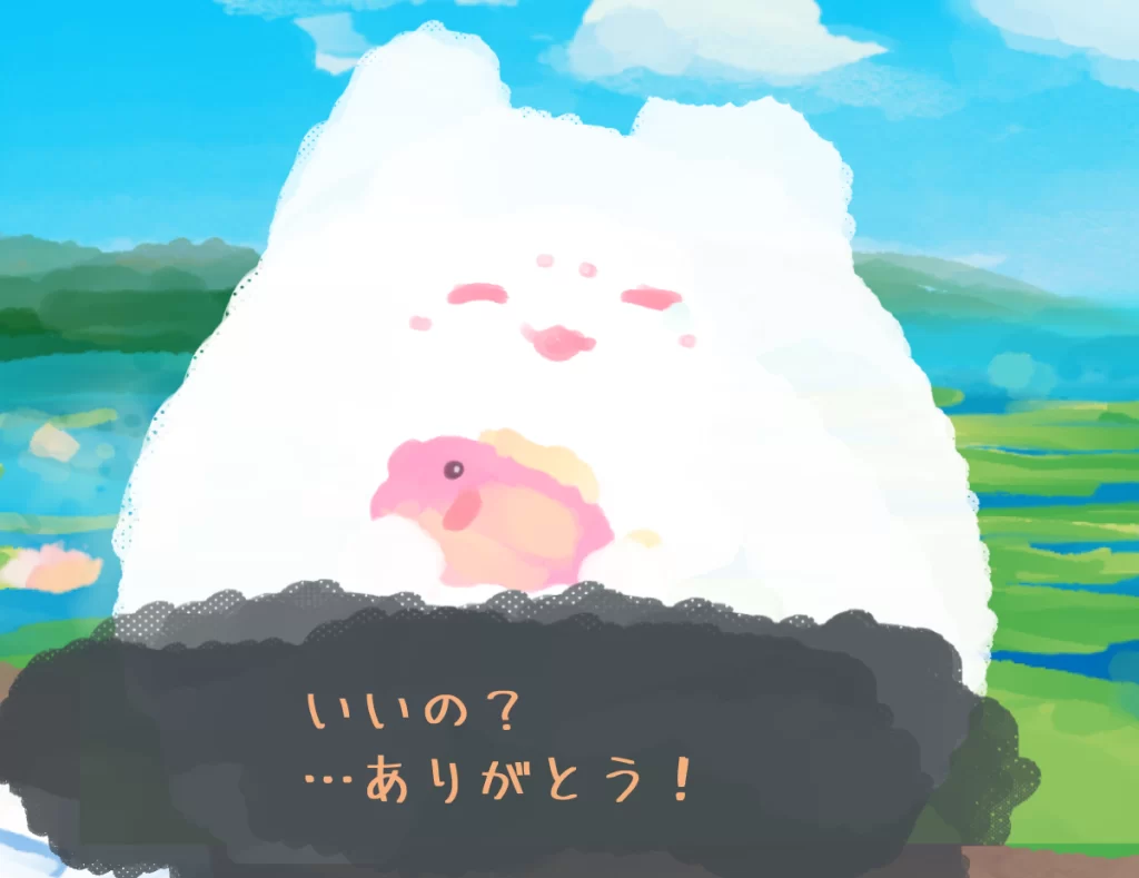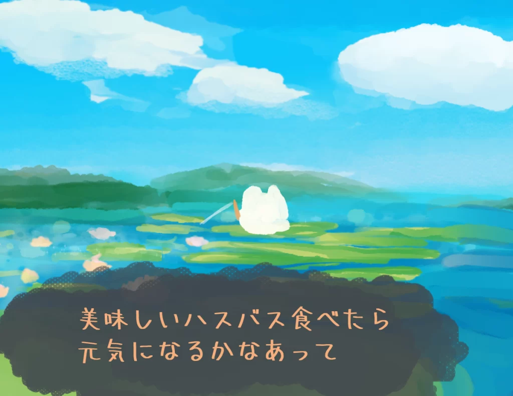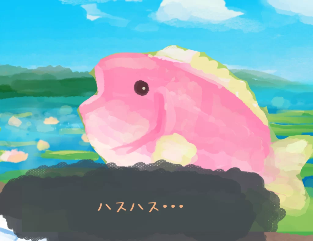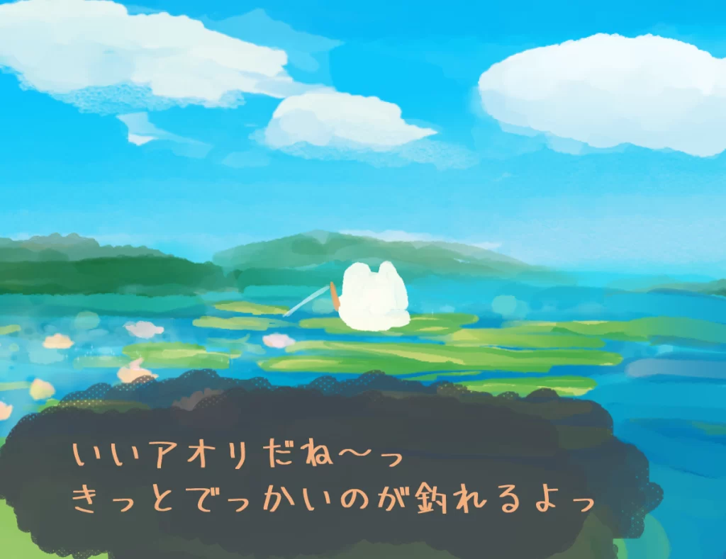 モフモフ生物はお友達を元気付けるために、ハスバスを釣っているようです。