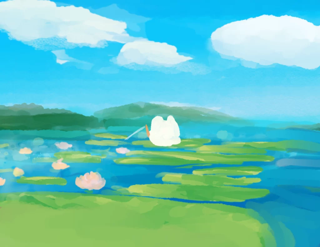 モフモフ生物とハスの葉に諭されてあなたはハス橋を渡ります。